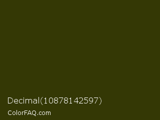 Decimal 10878142597 Color is a very dark yellow color and the nearest color is Waiouru #363c0d. Hex code #343805 and RGB value is rgb(52,56,5). In RGB color space, this color is composed of 20% red, 22% green, 2% blue, In CMYK color space, this color is composed of 7% cyan, 0% magenta, 91% yellow , 78% black , In HSL color space, this color has a hue angle of 65° , 84% saturation and 12% lightness.