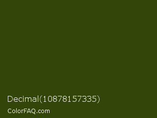 Decimal 10878157335 Color is a very dark lime color and the nearest color is Clover #384910. Hex code #344509 and RGB value is rgb(52,69,9). In RGB color space, this color is composed of 20% red, 27% green, 4% blue, In CMYK color space, this color is composed of 25% cyan, 0% magenta, 87% yellow , 73% black , In HSL color space, this color has a hue angle of 77° , 77% saturation and 15% lightness.