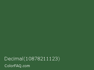 Decimal 10878211123 Color is a dark green color and the nearest color is Hunter Green #355e3b. Hex code #346139 and RGB value is rgb(52,97,57). In RGB color space, this color is composed of 20% red, 38% green, 22% blue, In CMYK color space, this color is composed of 46% cyan, 0% magenta, 41% yellow , 62% black , In HSL color space, this color has a hue angle of 127° , 30% saturation and 29% lightness.