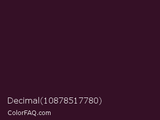 Decimal 10878517780 Color is a very dark magenta color and the nearest color is Melanzane #300529. Hex code #351026 and RGB value is rgb(53,16,38). In RGB color space, this color is composed of 21% red, 6% green, 15% blue, In CMYK color space, this color is composed of 0% cyan, 70% magenta, 28% yellow , 79% black , In HSL color space, this color has a hue angle of 324° , 54% saturation and 14% lightness.