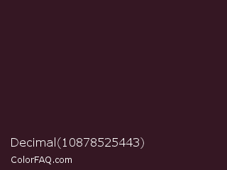 Decimal 10878525443 Color is a very dark rose color and the nearest color is Cocoa Brown #301f1e. Hex code #351723 and RGB value is rgb(53,23,35). In RGB color space, this color is composed of 21% red, 9% green, 14% blue, In CMYK color space, this color is composed of 0% cyan, 57% magenta, 34% yellow , 79% black , In HSL color space, this color has a hue angle of 336° , 39% saturation and 15% lightness.