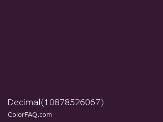 Decimal 10878526067 Color is a very dark magenta color and the nearest color is Dark Purple #301934. Hex code #351831 and RGB value is rgb(53,24,49). In RGB color space, this color is composed of 21% red, 9% green, 19% blue, In CMYK color space, this color is composed of 0% cyan, 55% magenta, 8% yellow , 79% black , In HSL color space, this color has a hue angle of 308° , 38% saturation and 15% lightness.