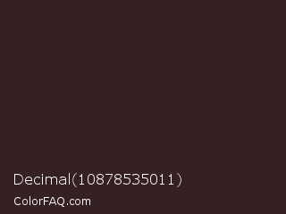 Decimal 10878535011 Color is a very dark red color and the nearest color is Cocoa Brown #301f1e. Hex code #352123 and RGB value is rgb(53,33,35). In RGB color space, this color is composed of 21% red, 13% green, 14% blue, In CMYK color space, this color is composed of 0% cyan, 38% magenta, 34% yellow , 79% black , In HSL color space, this color has a hue angle of 354° , 23% saturation and 17% lightness.