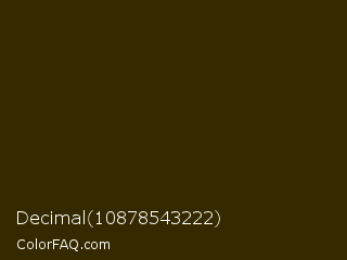 Decimal 10878543222 Color is a very dark yellow color and the nearest color is Cola #3f2500. Hex code #352900 and RGB value is rgb(53,41,0). In RGB color space, this color is composed of 21% red, 16% green, 0% blue, In CMYK color space, this color is composed of 0% cyan, 23% magenta, 100% yellow , 79% black , In HSL color space, this color has a hue angle of 46° , 100% saturation and 10% lightness.