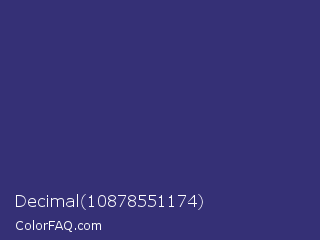 Decimal 10878551174 Color is a normal indigo color and the nearest color is Minsk #3f307f. Hex code #353076 and RGB value is rgb(53,48,118). In RGB color space, this color is composed of 21% red, 19% green, 46% blue, In CMYK color space, this color is composed of 55% cyan, 59% magenta, 0% yellow , 54% black , In HSL color space, this color has a hue angle of 244° , 42% saturation and 33% lightness.
