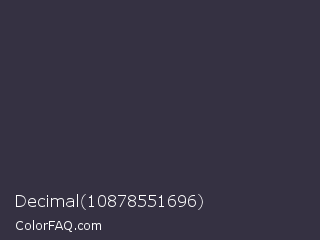 Decimal 10878551696 Color is a dark indigo color and the nearest color is Tuna #353542. Hex code #353142 and RGB value is rgb(53,49,66). In RGB color space, this color is composed of 21% red, 19% green, 26% blue, In CMYK color space, this color is composed of 20% cyan, 26% magenta, 0% yellow , 74% black , In HSL color space, this color has a hue angle of 254° , 15% saturation and 23% lightness.