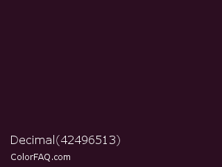 Decimal 42496513 Color is a very dark magenta color and the nearest color is Melanzane #300529. Hex code #2c0e21 and RGB value is rgb(44,14,33). In RGB color space, this color is composed of 17% red, 5% green, 13% blue, In CMYK color space, this color is composed of 0% cyan, 68% magenta, 25% yellow , 83% black , In HSL color space, this color has a hue angle of 322° , 52% saturation and 11% lightness.