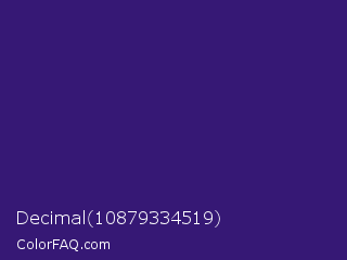 Decimal 10879334519 Color is a dark indigo color and the nearest color is Persian Indigo #32127a. Hex code #361875 and RGB value is rgb(54,24,117). In RGB color space, this color is composed of 21% red, 9% green, 46% blue, In CMYK color space, this color is composed of 54% cyan, 79% magenta, 0% yellow , 54% black , In HSL color space, this color has a hue angle of 259° , 66% saturation and 28% lightness.