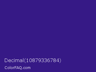 Decimal 10879336784 Color is a normal indigo color and the nearest color is Pixie Powder #391285. Hex code #361986 and RGB value is rgb(54,25,134). In RGB color space, this color is composed of 21% red, 10% green, 53% blue, In CMYK color space, this color is composed of 60% cyan, 81% magenta, 0% yellow , 47% black , In HSL color space, this color has a hue angle of 256° , 69% saturation and 31% lightness.