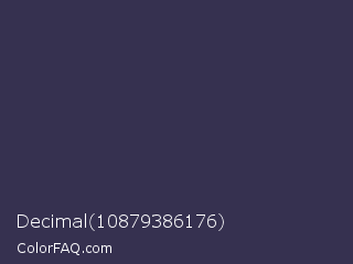 Decimal 10879386176 Color is a dark indigo color and the nearest color is Martinique #363050. Hex code #363150 and RGB value is rgb(54,49,80). In RGB color space, this color is composed of 21% red, 19% green, 31% blue, In CMYK color space, this color is composed of 33% cyan, 39% magenta, 0% yellow , 69% black , In HSL color space, this color has a hue angle of 250° , 24% saturation and 25% lightness.