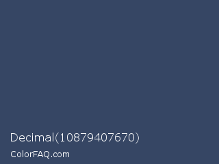 Decimal 10879407670 Color is a dark blue color and the nearest color is San Juan #304b6a. Hex code #364664 and RGB value is rgb(54,70,100). In RGB color space, this color is composed of 21% red, 27% green, 39% blue, In CMYK color space, this color is composed of 46% cyan, 30% magenta, 0% yellow , 61% black , In HSL color space, this color has a hue angle of 219° , 30% saturation and 30% lightness.