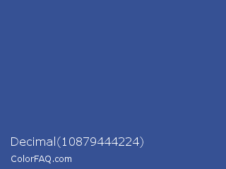 Decimal 10879444224 Color is a normal blue color and the nearest color is Chambray #354e8c. Hex code #365194 and RGB value is rgb(54,81,148). In RGB color space, this color is composed of 21% red, 32% green, 58% blue, In CMYK color space, this color is composed of 64% cyan, 45% magenta, 0% yellow , 42% black , In HSL color space, this color has a hue angle of 223° , 47% saturation and 40% lightness.
