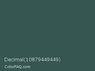 Decimal 10879449449 Color is a dark cyan color and the nearest color is Stromboli #325d52. Hex code #365751 and RGB value is rgb(54,87,81). In RGB color space, this color is composed of 21% red, 34% green, 32% blue, In CMYK color space, this color is composed of 38% cyan, 0% magenta, 7% yellow , 66% black , In HSL color space, this color has a hue angle of 169° , 23% saturation and 28% lightness.