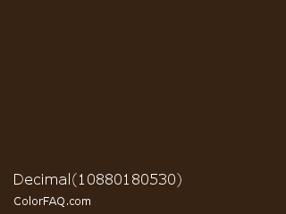 Decimal 10880180530 Color is a very dark orange color and the nearest color is Sambuca #3a2010. Hex code #372314 and RGB value is rgb(55,35,20). In RGB color space, this color is composed of 22% red, 14% green, 8% blue, In CMYK color space, this color is composed of 0% cyan, 36% magenta, 64% yellow , 78% black , In HSL color space, this color has a hue angle of 26° , 47% saturation and 15% lightness.