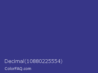 Decimal 10880225554 Color is a normal indigo color and the nearest color is Cosmic Cobalt #2e2d88. Hex code #373688 and RGB value is rgb(55,54,136). In RGB color space, this color is composed of 22% red, 21% green, 53% blue, In CMYK color space, this color is composed of 60% cyan, 60% magenta, 0% yellow , 47% black , In HSL color space, this color has a hue angle of 241° , 43% saturation and 37% lightness.