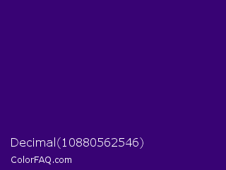 Decimal 10880562546 Color is a dark violet color and the nearest color is Blue Diamond #380474. Hex code #380374 and RGB value is rgb(56,3,116). In RGB color space, this color is composed of 22% red, 1% green, 45% blue, In CMYK color space, this color is composed of 52% cyan, 97% magenta, 0% yellow , 55% black , In HSL color space, this color has a hue angle of 268° , 95% saturation and 23% lightness.
