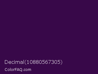 Decimal 10880567305 Color is a very dark purple color and the nearest color is Valentino #350e42. Hex code #380849 and RGB value is rgb(56,8,73). In RGB color space, this color is composed of 22% red, 3% green, 29% blue, In CMYK color space, this color is composed of 23% cyan, 89% magenta, 0% yellow , 71% black , In HSL color space, this color has a hue angle of 284° , 80% saturation and 16% lightness.