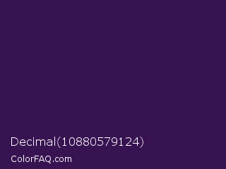 Decimal 10880579124 Color is a very dark purple color and the nearest color is Deep Grape #381a51. Hex code #381352 and RGB value is rgb(56,19,82). In RGB color space, this color is composed of 22% red, 7% green, 32% blue, In CMYK color space, this color is composed of 32% cyan, 77% magenta, 0% yellow , 68% black , In HSL color space, this color has a hue angle of 275° , 62% saturation and 20% lightness.