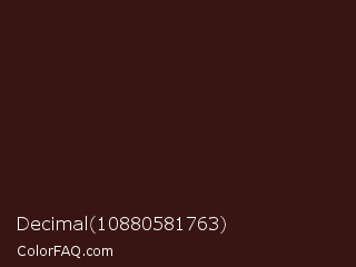 Decimal 10880581763 Color is a very dark red color and the nearest color is Dark Sienna #3c1414. Hex code #381513 and RGB value is rgb(56,21,19). In RGB color space, this color is composed of 22% red, 8% green, 7% blue, In CMYK color space, this color is composed of 0% cyan, 63% magenta, 66% yellow , 78% black , In HSL color space, this color has a hue angle of 3° , 49% saturation and 15% lightness.