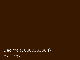 Decimal 10880585864 Color is a very dark orange color and the nearest color is Brown Pod #401801. Hex code #381900 and RGB value is rgb(56,25,0). In RGB color space, this color is composed of 22% red, 10% green, 0% blue, In CMYK color space, this color is composed of 0% cyan, 55% magenta, 100% yellow , 78% black , In HSL color space, this color has a hue angle of 27° , 100% saturation and 11% lightness.