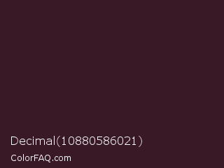 Decimal 10880586021 Color is a very dark rose color and the nearest color is Jon #3b1f1f. Hex code #381925 and RGB value is rgb(56,25,37). In RGB color space, this color is composed of 22% red, 10% green, 15% blue, In CMYK color space, this color is composed of 0% cyan, 55% magenta, 34% yellow , 78% black , In HSL color space, this color has a hue angle of 337° , 38% saturation and 16% lightness.