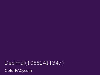 Decimal 10881411347 Color is a very dark purple color and the nearest color is Deep Grape #381a51. Hex code #391251 and RGB value is rgb(57,18,81). In RGB color space, this color is composed of 22% red, 7% green, 32% blue, In CMYK color space, this color is composed of 30% cyan, 78% magenta, 0% yellow , 68% black , In HSL color space, this color has a hue angle of 277° , 64% saturation and 19% lightness.
