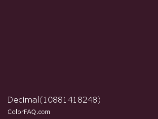 Decimal 10881418248 Color is a very dark rose color and the nearest color is Jon #3b1f1f. Hex code #391828 and RGB value is rgb(57,24,40). In RGB color space, this color is composed of 22% red, 9% green, 16% blue, In CMYK color space, this color is composed of 0% cyan, 58% magenta, 30% yellow , 78% black , In HSL color space, this color has a hue angle of 331° , 41% saturation and 16% lightness.