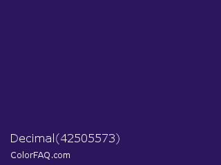 Decimal 42505573 Color is a dark indigo color and the nearest color is Violent Violet #290c5e. Hex code #2c175d and RGB value is rgb(44,23,93). In RGB color space, this color is composed of 17% red, 9% green, 36% blue, In CMYK color space, this color is composed of 53% cyan, 75% magenta, 0% yellow , 64% black , In HSL color space, this color has a hue angle of 258° , 60% saturation and 23% lightness.