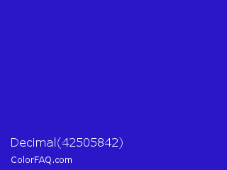 Decimal 42505842 Color is a normal indigo color and the nearest color is Interdimensional Blue #360ccc. Hex code #2c17c8 and RGB value is rgb(44,23,200). In RGB color space, this color is composed of 17% red, 9% green, 78% blue, In CMYK color space, this color is composed of 78% cyan, 89% magenta, 0% yellow , 22% black , In HSL color space, this color has a hue angle of 247° , 79% saturation and 44% lightness.