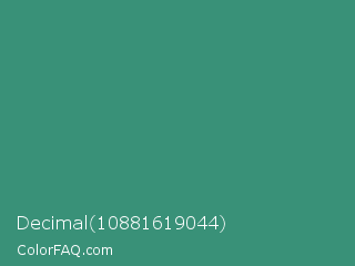 Decimal 10881619044 Color is a normal green color and the nearest color is Illuminating Emerald #319177. Hex code #399178 and RGB value is rgb(57,145,120). In RGB color space, this color is composed of 22% red, 57% green, 47% blue, In CMYK color space, this color is composed of 61% cyan, 0% magenta, 17% yellow , 43% black , In HSL color space, this color has a hue angle of 163° , 44% saturation and 40% lightness.