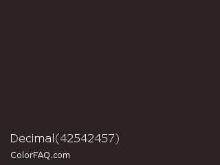 Decimal 42542457 Color is a very dark red color and the nearest color is Cocoa Brown #301f1e. Hex code #2c2323 and RGB value is rgb(44,35,35). In RGB color space, this color is composed of 17% red, 14% green, 14% blue, In CMYK color space, this color is composed of 0% cyan, 20% magenta, 20% yellow , 83% black , In HSL color space, this color has a hue angle of 0° , 11% saturation and 15% lightness.