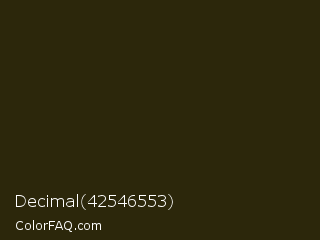 Decimal 42546553 Color is a very dark yellow color and the nearest color is Onion #2f270e. Hex code #2c270b and RGB value is rgb(44,39,11). In RGB color space, this color is composed of 17% red, 15% green, 4% blue, In CMYK color space, this color is composed of 0% cyan, 11% magenta, 75% yellow , 83% black , In HSL color space, this color has a hue angle of 51° , 60% saturation and 11% lightness.