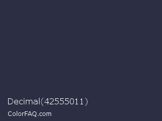 Decimal 42555011 Color is a very dark blue color and the nearest color is Tuna #353542. Hex code #2c2f43 and RGB value is rgb(44,47,67). In RGB color space, this color is composed of 17% red, 18% green, 26% blue, In CMYK color space, this color is composed of 34% cyan, 30% magenta, 0% yellow , 74% black , In HSL color space, this color has a hue angle of 232° , 21% saturation and 22% lightness.