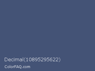 Decimal 10895295622 Color is a normal blue color and the nearest color is East Bay #414c7d. Hex code #445376 and RGB value is rgb(68,83,118). In RGB color space, this color is composed of 27% red, 33% green, 46% blue, In CMYK color space, this color is composed of 42% cyan, 30% magenta, 0% yellow , 54% black , In HSL color space, this color has a hue angle of 222° , 27% saturation and 36% lightness.