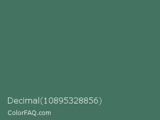 Decimal 10895328856 Color is a normal green color and the nearest color is Hookers Green #49796b. Hex code #447362 and RGB value is rgb(68,115,98). In RGB color space, this color is composed of 27% red, 45% green, 38% blue, In CMYK color space, this color is composed of 41% cyan, 0% magenta, 15% yellow , 55% black , In HSL color space, this color has a hue angle of 158° , 26% saturation and 36% lightness.