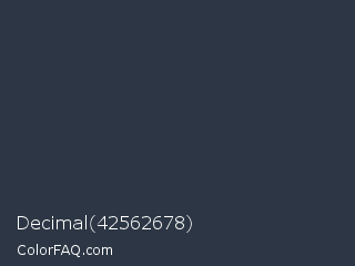 Decimal 42562678 Color is a very dark blue color and the nearest color is Tuna #353542. Hex code #2c3644 and RGB value is rgb(44,54,68). In RGB color space, this color is composed of 17% red, 21% green, 27% blue, In CMYK color space, this color is composed of 35% cyan, 21% magenta, 0% yellow , 73% black , In HSL color space, this color has a hue angle of 215° , 21% saturation and 22% lightness.