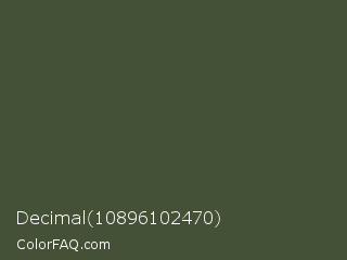 Decimal 10896102470 Color is a dark green color and the nearest color is Rifle Green #444c38. Hex code #455136 and RGB value is rgb(69,81,54). In RGB color space, this color is composed of 27% red, 32% green, 21% blue, In CMYK color space, this color is composed of 15% cyan, 0% magenta, 33% yellow , 68% black , In HSL color space, this color has a hue angle of 87° , 20% saturation and 26% lightness.