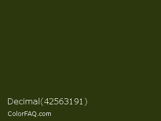 Decimal 42563191 Color is a very dark lime color and the nearest color is Turtle Green #2a380b. Hex code #2c370d and RGB value is rgb(44,55,13). In RGB color space, this color is composed of 17% red, 22% green, 5% blue, In CMYK color space, this color is composed of 20% cyan, 0% magenta, 76% yellow , 78% black , In HSL color space, this color has a hue angle of 76° , 62% saturation and 13% lightness.