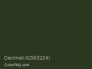 Decimal 42563224 Color is a very dark green color and the nearest color is Rangitoto #2e3222. Hex code #2c3722 and RGB value is rgb(44,55,34). In RGB color space, this color is composed of 17% red, 22% green, 13% blue, In CMYK color space, this color is composed of 20% cyan, 0% magenta, 38% yellow , 78% black , In HSL color space, this color has a hue angle of 91° , 24% saturation and 17% lightness.