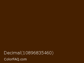 Decimal 10896835460 Color is a very dark orange color and the nearest color is Morocco Brown #441d00. Hex code #462000 and RGB value is rgb(70,32,0). In RGB color space, this color is composed of 27% red, 13% green, 0% blue, In CMYK color space, this color is composed of 0% cyan, 54% magenta, 100% yellow , 73% black , In HSL color space, this color has a hue angle of 27° , 100% saturation and 14% lightness.