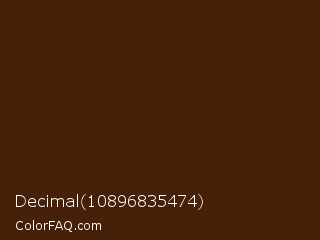 Decimal 10896835474 Color is a very dark orange color and the nearest color is Bronze Pantone #3f2109. Hex code #462008 and RGB value is rgb(70,32,8). In RGB color space, this color is composed of 27% red, 13% green, 3% blue, In CMYK color space, this color is composed of 0% cyan, 54% magenta, 89% yellow , 73% black , In HSL color space, this color has a hue angle of 23° , 79% saturation and 15% lightness.
