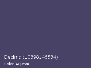 Decimal 10898146584 Color is a normal indigo color and the nearest color is Mulled Wine #4e4562. Hex code #484366 and RGB value is rgb(72,67,102). In RGB color space, this color is composed of 28% red, 26% green, 40% blue, In CMYK color space, this color is composed of 29% cyan, 34% magenta, 0% yellow , 60% black , In HSL color space, this color has a hue angle of 249° , 21% saturation and 33% lightness.