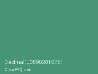 Decimal 10898281075 Color is a normal green color and the nearest color is Wintergreen Dream #56887d. Hex code #489479 and RGB value is rgb(72,148,121). In RGB color space, this color is composed of 28% red, 58% green, 47% blue, In CMYK color space, this color is composed of 51% cyan, 0% magenta, 18% yellow , 42% black , In HSL color space, this color has a hue angle of 159° , 35% saturation and 43% lightness.