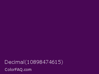Decimal 10898474615 Color is a very dark purple color and the nearest color is Clairvoyant #480656. Hex code #490755 and RGB value is rgb(73,7,85). In RGB color space, this color is composed of 29% red, 3% green, 33% blue, In CMYK color space, this color is composed of 14% cyan, 92% magenta, 0% yellow , 67% black , In HSL color space, this color has a hue angle of 291° , 85% saturation and 18% lightness.