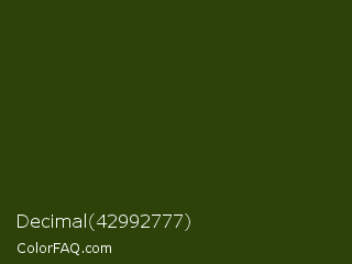 Decimal 42992777 Color is a very dark green color and the nearest color is Turtle Green #2a380b. Hex code #2c4209 and RGB value is rgb(44,66,9). In RGB color space, this color is composed of 17% red, 26% green, 4% blue, In CMYK color space, this color is composed of 33% cyan, 0% magenta, 86% yellow , 74% black , In HSL color space, this color has a hue angle of 83° , 76% saturation and 15% lightness.