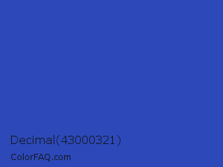 Decimal 43000321 Color is a normal blue color and the nearest color is Violet Blue #324ab2. Hex code #2c48b9 and RGB value is rgb(44,72,185). In RGB color space, this color is composed of 17% red, 28% green, 73% blue, In CMYK color space, this color is composed of 76% cyan, 61% magenta, 0% yellow , 27% black , In HSL color space, this color has a hue angle of 228° , 62% saturation and 45% lightness.