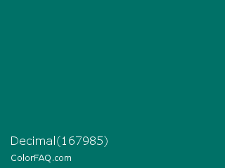 Decimal 167985 Color is a very dark cyan color and the nearest color is Tropical Rain Forest #00755e. Hex code #007167 and RGB value is rgb(0,113,103). In RGB color space, this color is composed of 0% red, 44% green, 40% blue, In CMYK color space, this color is composed of 100% cyan, 0% magenta, 9% yellow , 56% black , In HSL color space, this color has a hue angle of 175° , 100% saturation and 22% lightness.