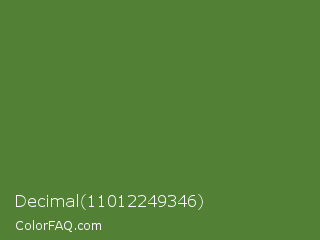 Decimal 11012249346 Color is a normal green color and the nearest color is Sap Green #507d2a. Hex code #528136 and RGB value is rgb(82,129,54). In RGB color space, this color is composed of 32% red, 51% green, 21% blue, In CMYK color space, this color is composed of 36% cyan, 0% magenta, 58% yellow , 49% black , In HSL color space, this color has a hue angle of 98° , 41% saturation and 36% lightness.