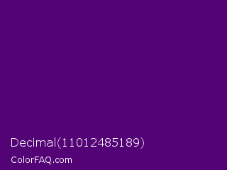 Decimal 11012485189 Color is a dark purple color and the nearest color is Pigment Indigo #4b0082. Hex code #530375 and RGB value is rgb(83,3,117). In RGB color space, this color is composed of 33% red, 1% green, 46% blue, In CMYK color space, this color is composed of 29% cyan, 97% magenta, 0% yellow , 54% black , In HSL color space, this color has a hue angle of 282° , 95% saturation and 24% lightness.