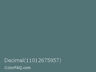Decimal 11012675957 Color is a normal cyan color and the nearest color is Cutty Sark #507672. Hex code #537477 and RGB value is rgb(83,116,119). In RGB color space, this color is composed of 33% red, 45% green, 47% blue, In CMYK color space, this color is composed of 30% cyan, 3% magenta, 0% yellow , 53% black , In HSL color space, this color has a hue angle of 185° , 18% saturation and 40% lightness.